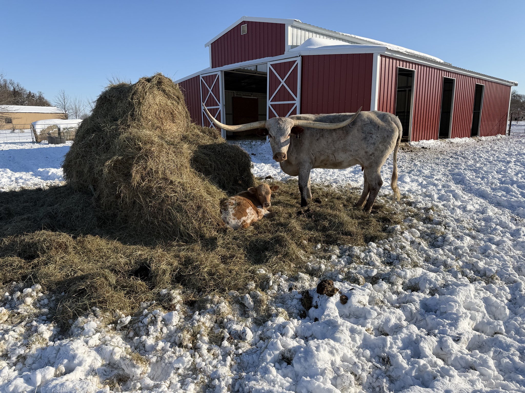 Absolutely gorgeous heifer calf from 89" nearly 2000lb Line Up. Her emerging color pattern mirrors her mother's and seems to be changing by the day. Her Dam HL Possum Princess measured 86" December of '25 of the most beautiful symmetrical twist we've ever seen. Pearl is a half brother to Double S Tiger King, who won bronze at Millennium Futurity this year and placed 7th (out of 265) bulls in the NFLR.